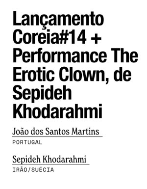 THE EROTIC CLOWN, DE SEPIDEH KHODARAHMICOREIA#14SALãO BRAZIL Largo do Poço, nº3, 1º Andar 3000-335 COIMBRA 05 MAR - 05 MAR 2026 LANÇAMENTO COREIA#14 + PERFORMANCE The Erotic Clown, de Sepideh Khodarahmi 5 Março, 18h30, Salão Brazil (largo do poço) entrada gratuita A Linha de Fuga acolhe o lançamento do Jornal Coreia, que chega ao número #14 reforçando a natureza de um arquivo de gestos capaz de propor reflexões sobre o poder da memória, sobre as origens, responsabilidades e futuros sem ignorar a dor, e, acima de tudo, dançando e cantando pela liberdade. No Coreia #14, chegamos tarde e saÃmos cedo, com o Ricardo Valentim. Encontramo-nos com Carlo Canún no Cine Savoy, no encontro de corpos que se convertem em texto e constroem as suas próprias narrativas. Movimento coreográfico inconsciente, voo de pássaros quotidiano aos olhos de Odile Duboc. Com Xueying Peng, um gesto de cooperação dá inÃcio a performance e o espaço passa a imaginação partilhada. O espaço é consequência, e Sarah Lewis reflete sobre um encontro deferido com o poder amargo da memória. Pensemos com as ferramentas de CATPC e Human Activities, evitemos armadilhas, repensemos origens, responsabilidades e futuros. Para aprendermos a cair aprendemos a confiar no chão, e com Catarina Câmara escolhemos o corpo e o movimento como instrumentos de relação com o mundo. Sepideh Khodarahmi sente-se pelo excesso, Itziar Okariz conhece pelo som da respiração e Marine Chesnais explora pela apneia. Somos um arquivo de gestos trazido por Marta Lopes Santos e, entre real e imaginado, uma construção narrativa vivida por Raphael Daibert. Sina Saberi traz-nos de volta à memória do corpo que também é referência do lugar. Não ignoramos a dor, dançamos a possibilidade de transformar, movendo-nos em conjunto, cantando pela liberdade. E quando não conseguimos, tentamos. O lançamento desta edição do Coreia é acompanhado pela performance "The Erotic Clown" de Sepideh Khodarahmi em colaboração com Cracked Bolos. †The Erotic Clown por Sepideh Khodarahmi Equilibrando sedução, humor e desconforto, The Erotic Clown propõe o erotismo como um campo relacional e mutável que emerge através do excesso, do fracasso e da degradação material. A performance convida o público a confrontar os seus próprios limiares de prazer e repulsa e a reconsiderar como o valor erótico é produzido, regulado e desfeito no interior de sistemas sociais e estéticos. Um convite a fruir da paisagem da articulação pélvica e a testemunhar uma narrativa escrita em gosma e escombros. ::: Coreia é uma publicação fundada em 2019 de carácter experimental, crÃtico e discursivo a propósito das artes em geral, firmada numa relação umbilical com a dança. De tiragem semestral, o jornal pretende ser um fórum independente e internacionalista focado no discurso produzido pelas obras e pelos artistas, preocupado em divulgar formatos variados como partituras, manifestos, entrevistas, crónicas, ensaios, crÃticas e reflexões em lÃngua portuguesa. |